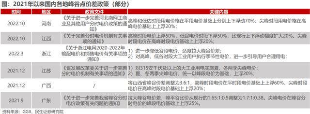 前面提到,終端看政策。2022年12月22日,國家發改委、國家能源局印發《關于做好2023年電力中長期合同簽訂履約工作的通知》,要求各地制定同本地電力供需和市場建設情況相適應的中長期合同分時段價格形成機制,合理拉大峰谷價差,加強中長期與現貨價格機制銜接。自2021年下半年以來,全國已有河南、江西、浙江、河北、山西、廣東、山東等超過20個省市調整分時電價政策,要求適度拉大峰谷電價差水平。