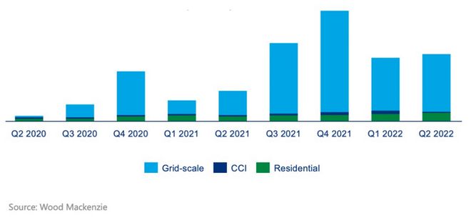 2020年及2021年美國(guó)儲(chǔ)能裝機(jī)量分別達(dá)到3529/10499MW,增長(zhǎng)率237%/198%。根據(jù)WoodMackenzie與美國(guó)清潔能源協(xié)會(huì)聯(lián)合發(fā)布的研究報(bào)告顯示,2022年上半年,美國(guó)儲(chǔ)能市場(chǎng)裝機(jī)容量2305MW/5917MWh,其中22Q2電網(wǎng)級(jí)儲(chǔ)能安裝容量達(dá)到1,170 MW/2,608 MWh, 是有史以來(lái)第二季度的最高裝機(jī)容量 。