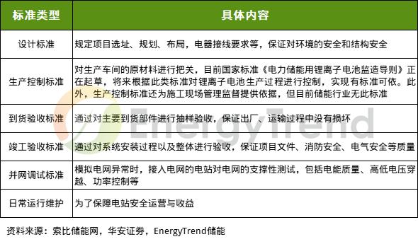 在光伏強制配儲的背景下,缺乏電網(wǎng)公司對儲能系統(tǒng)調(diào)度頻次、充放電次數(shù)等的明確規(guī)定,儲能產(chǎn)品的質(zhì)量和安全無法保證。圖:儲能全流程涉及六類標(biāo)準(zhǔn)
