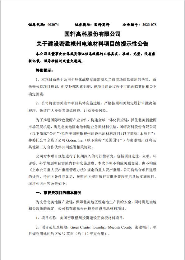 從最新公告的情況來看,國軒高科赴美投建材料工廠事項已經靴子落地,而工廠選址與投資額與此前消息基本相符。