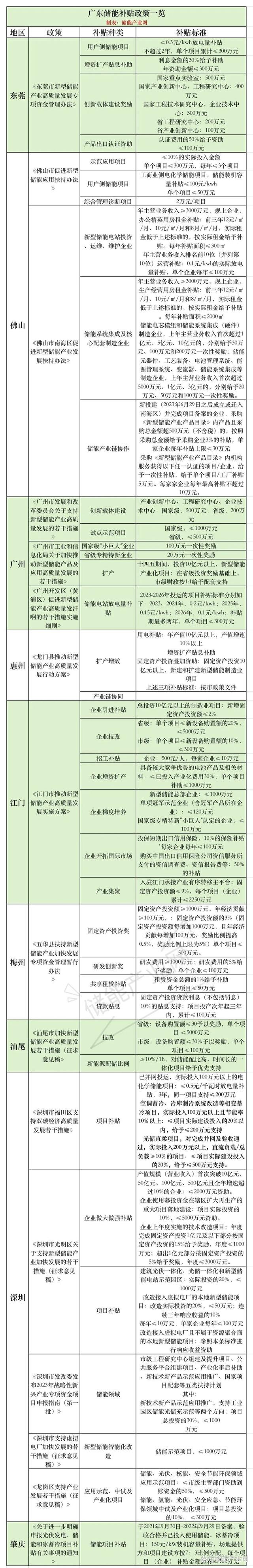 廣東省各市區(qū)縣級政府出臺儲能獎補政策如下。