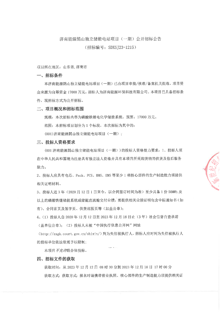 12月11日,濟南能源鵲山獨立儲能電站項目(一期)公開招標。項目預算為1.7億元,招標內容為磷酸鐵鋰電化學儲能系統。