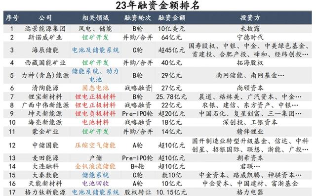 2023年,部分企業獲取高額融資,遠景能源、海辰儲能融資領銜。
