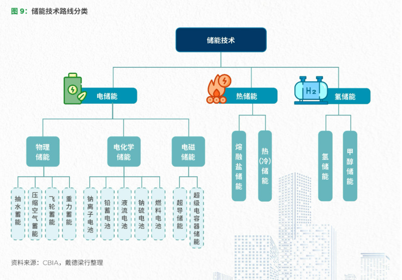 儲能,是指通過不同方式、利用特定的裝置或物理介質(zhì),將不同形式的能量儲存起來,以便在需要時(shí)利用的技術(shù)。根據(jù)技術(shù)路徑不同,儲能形式主要分為電儲能、熱儲能和氫儲能三大類,其中電化學(xué)與物理儲能為現(xiàn)階段主要技術(shù)路線。儲能系統(tǒng)是新型電力系統(tǒng)有效的調(diào)峰調(diào)頻、平滑波動(dòng)手段及重要的備用資源,大力發(fā)展儲能對提高光伏、風(fēng)電等可再生能源利用率,實(shí)現(xiàn)“雙碳”目標(biāo)具有重要意義。