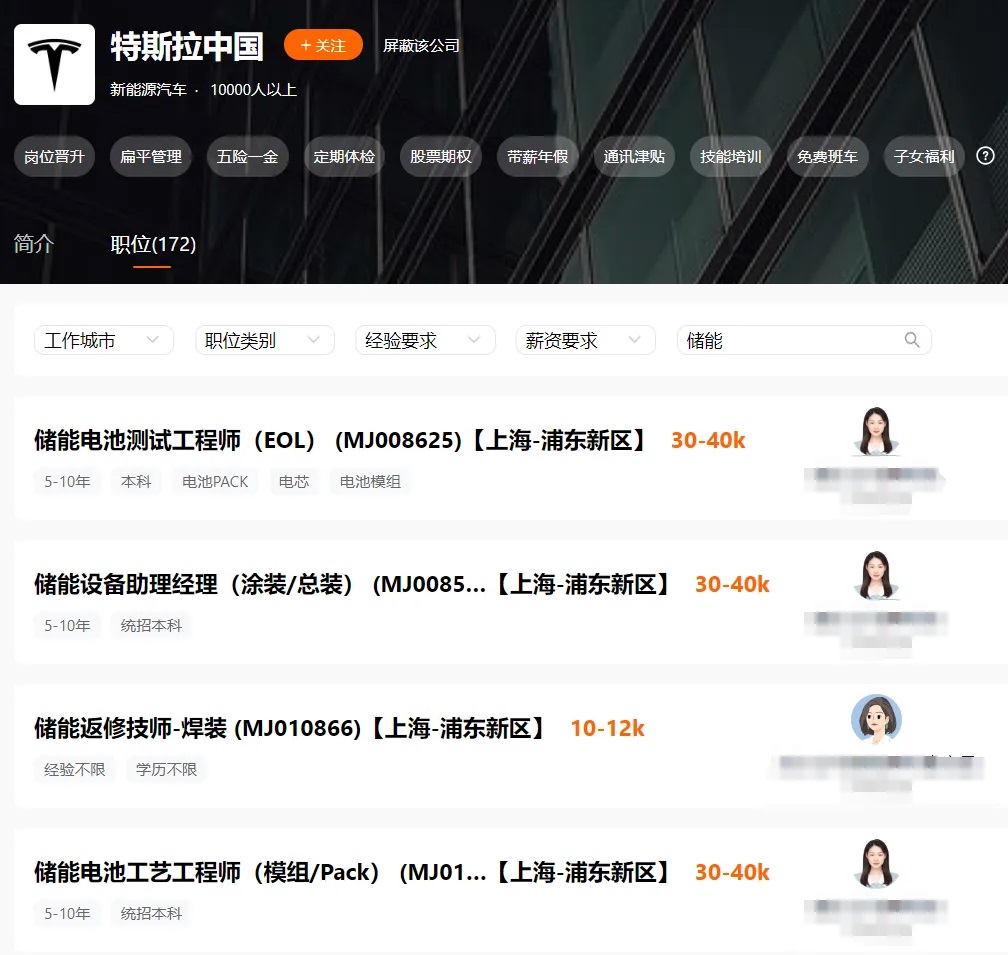 據了解,特斯拉中國官網顯示,目前“急聘”的儲能崗位包括:儲能項目工程師、儲能項目經理、儲能產品工程師(Megepack)、電芯驗證工程師等。