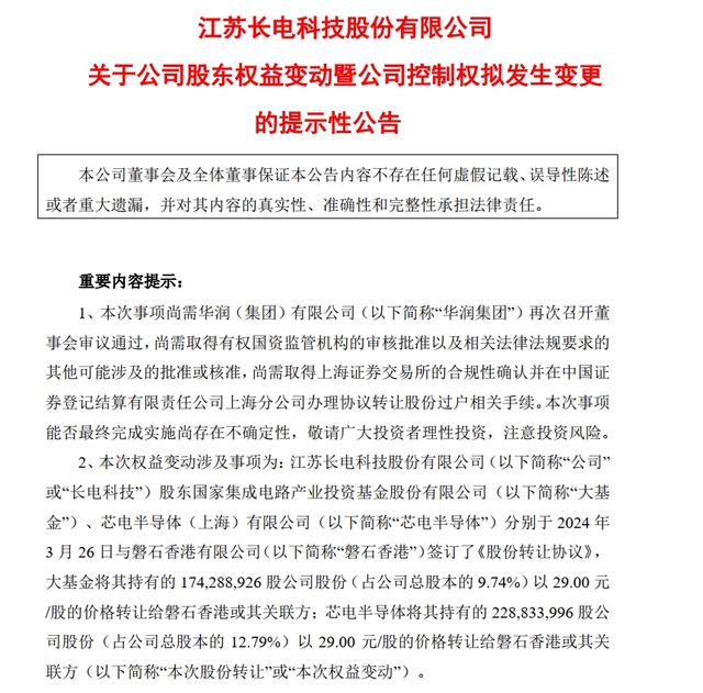 3月26日晚間,長電科技(SH600584,股價28.25元,市值505.3億元)發布公告稱,公司股東國家集成電路產業投資基金股份有限公司(以下簡稱“大基金”)、芯電半導體(上海)有限公司(以下簡稱“芯電半導體”)分別與磐石香港有限公司(以下簡稱“磐石香港”)簽訂《股份轉讓協議》,大基金及芯電半導體均以29元/股價格將合計所持22.53%公司股份轉讓給磐石香港或其關聯方;完成后公司控股股東將變更為磐石香港或其關聯方,實控人將變更為中國華潤,公司股票復牌。
