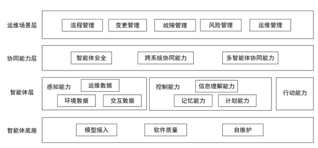 該架構以?場景需求為牽引??,通過協同層打通系統壁壘,以智能體層的感知-決策-行動閉環(huán)為核心能力載體,最終由底座提供工程化支撐。四層能力環(huán)環(huán)相扣,既明確了技術能力邊界,又強調實際落地場景的適配性,為企業(yè)構建智能運維體系提供清晰的模塊化建設路徑。