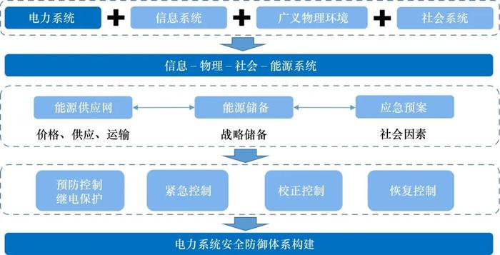 在信息物理社會系統(tǒng)框架方面,采用機理分析和沙盤推演手段,開展極端事件、綜合能源、政策機制、規(guī)劃運行的“時 ? 空 ? 物”要素分析;研究不確定性因素對能源 ? 電力可靠性及經(jīng)濟性的影響規(guī)律,構(gòu)建覆蓋電力系統(tǒng)運行過程,具有多類目標、多道防線能力的電力安全主動防御體系。