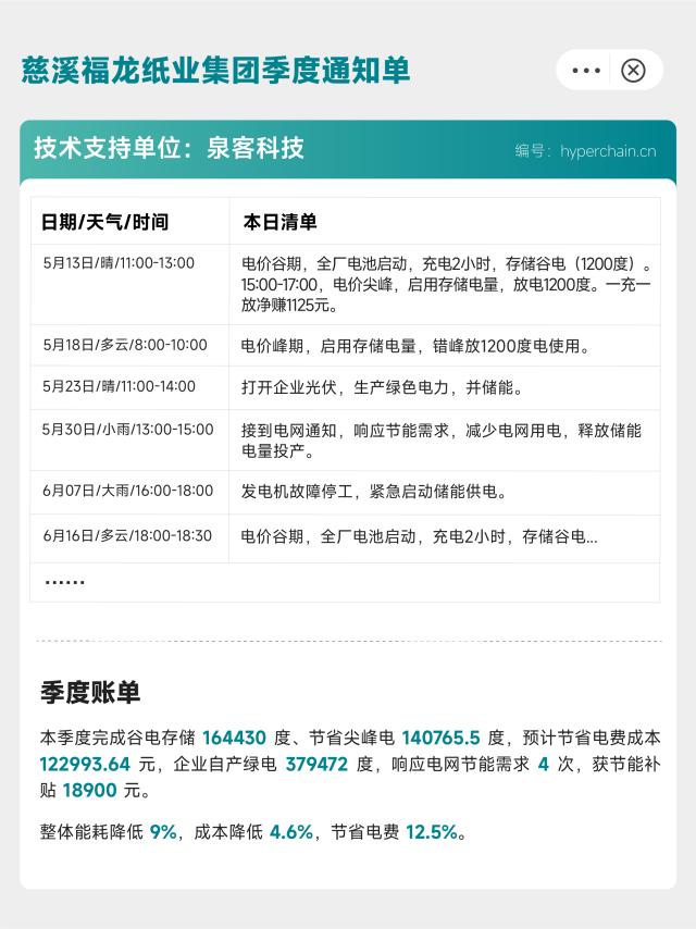 賬單顯示,本季度工廠完成谷電存儲16000余度、節(jié)省尖峰電14000余度,預計節(jié)省電費成本超過12萬元,企業(yè)自產(chǎn)綠電近40萬度,響應電網(wǎng)節(jié)能需求4次,獲節(jié)能補貼近2萬元。整體能耗降低9%,成本降低4.6%,節(jié)省電費12.5%。陳師傅感嘆道:“前段時間老板聯(lián)系了一家高新技術企業(yè)給我們做了電化學儲能系統(tǒng),我是不懂啥原理,但是還真有效果!”