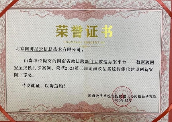 網(wǎng)御星云作為協(xié)辦單位受邀出席本次大會(huì),公司申報(bào)的“湖南省政法跨部門(mén)大數(shù)據(jù)辦案平臺(tái)——數(shù)據(jù)跨網(wǎng)安全交換共享案例”榮獲2023第三屆湖南政法系統(tǒng)智能化建設(shè)創(chuàng)新案例一等獎(jiǎng)!