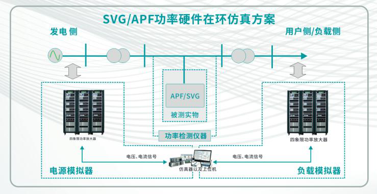 SVG/APF功率硬件在環仿真方案:在新型電力系統應用場景中,PAS放大器與仿真器的結合,能夠對發電側和負載側進行數字化模擬,結合功率檢測儀的實測數據,通過數據采集系統,可實現以APF,SVG為被測設備的半實物功率硬件在環仿真測試。