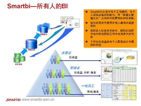數據應用即為數據的應用、交換與服務,需要通過思邁特軟件Smartbi等可視化的途徑直接服務于企業的一線生產人員、監管人員、業務負責人、公司高層以及企業董事。