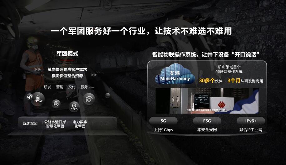 為了幫助企業選好技術、用好技術,另一個關鍵措施就是成立軍團。自去年底,我們已面向煤礦、港口、電力等多個行業成立了多個軍團組織。軍團是專業化隊伍,一方面,對內拉通端到端的資源,包括研發、銷售、交付、服務等,以便深入理解行業的生產實踐和行業知識,打造適配場景的產品和解決方案;另一方面,對外聯合更多的解決方案伙伴,把華為和伙伴的能力整合在一起,形成針對性的解決方案。