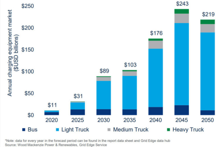 伍德·麥肯齊(Wood Mackenzie)近日發布的一份報告顯示,預計到2045年,電動汽車充電基礎設施市場規模將達到2430億美元,而在隨后的五年中,電動汽車充電基礎設施的市場規模將下降近250億美元,降至2190億美元。
