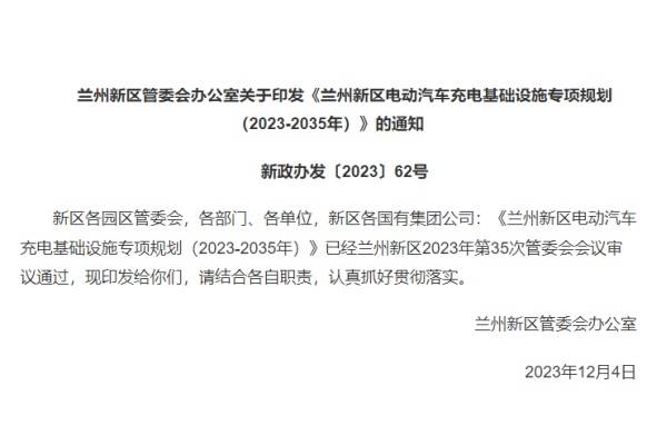12月18日,蘭州新區管委會發布《蘭州新區電動汽車充電基礎設施專項規劃(2023-2035年)》。