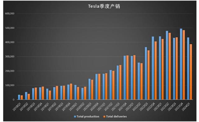 今年一季度,特斯拉的全球交付量為38.7萬輛,同比下降8.5%,環比下降20.2%;全球產量為43.3萬輛,同比下降1.7%,環比下降12.4%,這是特斯拉歷史上首次產銷量出現同比和環比的雙雙下降。