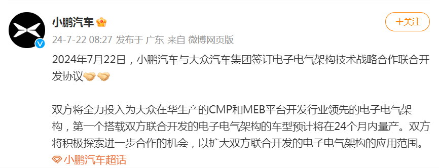 今年以來,小鵬汽車與大眾汽車集團已簽署三個協議。除上述兩個電子電氣架構相關協議外,今年2月29日,小鵬汽車與大眾集團宣布,簽訂平臺與軟件聯合開發協議,加速兩款B級純電動汽車的聯合研發,將于2026年上市,面向中國市場,首款車型為SUV。