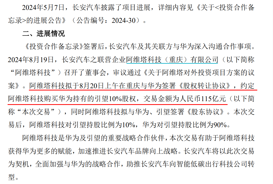 8月19日晚,長安汽車發布公告稱,聯營企業阿維塔科技擬購買華為持有的深圳引望10%股權,交易金額為115億元。出資方式為現金出資,資金來源為阿維塔科技的自有資金。本次交易后,阿維塔科技對引望持股比例為10%,華為對引望持股比例為90%。同時,阿維塔科技擬于8月20日與華為、深圳引望簽署《股東協議》。