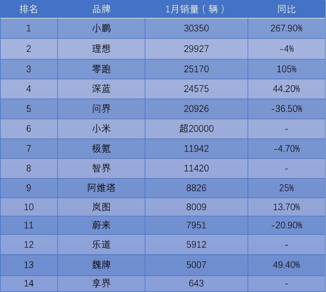 但仍有企業實現銷量“開門紅”,其中小鵬汽車、奇瑞汽車(新能源)、零跑汽車1月銷量增長率均突破100%。小鵬汽車更是以268%的增長率,時隔30個月后再次登頂新造車企業銷量排行榜。同時,小米汽車以月銷超2萬輛首次超越了蔚來。