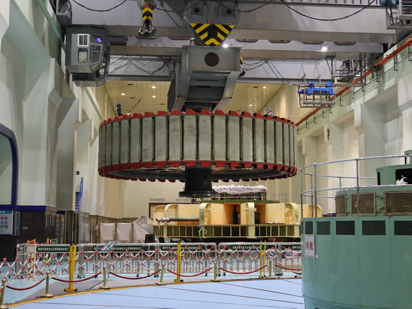 中國電力網訊 4月29日上午,記者在國網甘肅劉家峽水電廠廠房內看到,在現場起重指揮的哨聲下,該廠700多噸的4號發電機轉子,經過三起三落的試探性起吊后順利回裝至發電機定子中央,標志著該廠號4號機組A級檢修及定子改造工程進入了關鍵階段。