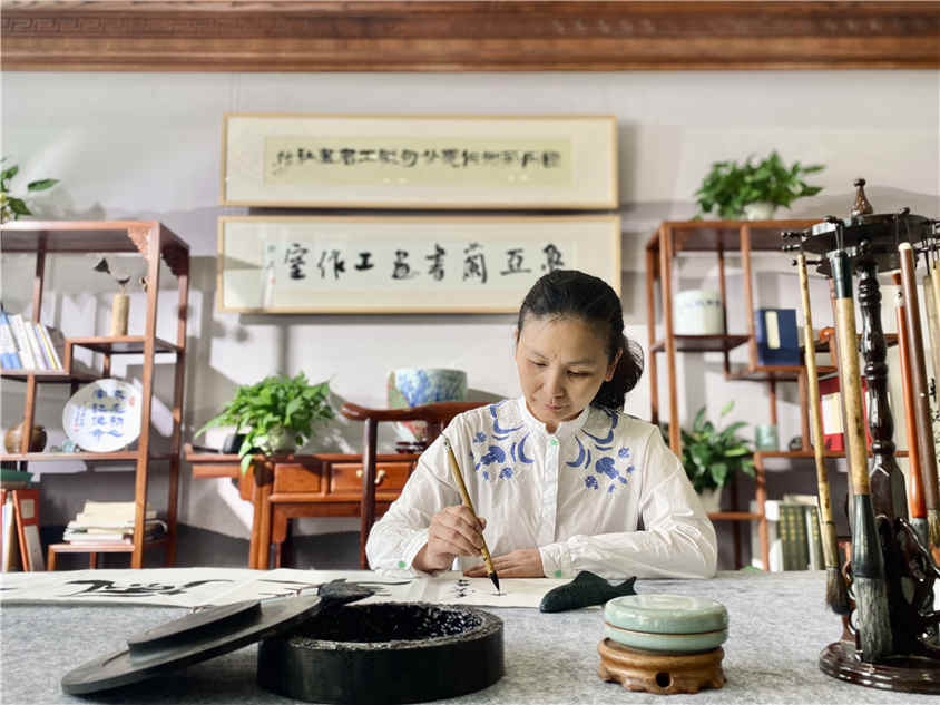 走進(jìn)魯亞蘭書(shū)畫(huà)工作室,午后陽(yáng)光斜照,滿(mǎn)室墨香氤氳。墻上懸掛的一幅隸書(shū)作品,筆力雄渾如鐵畫(huà)銀鉤,氣韻生動(dòng)若行云流水,落款處“魯亞蘭”三字清雅蘊(yùn)藉。這身非凡造詣,源于一方硯臺(tái)的啟蒙。