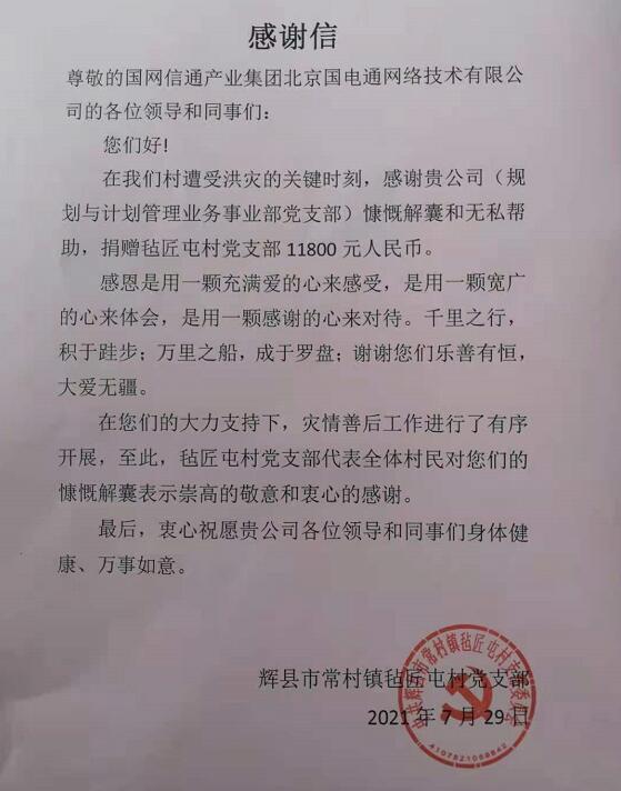 中國電力網(wǎng)訊 (通訊員 朱友宇) “在您們的大力支持下,災(zāi)情善后工作進(jìn)行了有序開展,至此,氈匠屯村黨支部代表全體村民對(duì)您們的慷慨解囊表示崇高的敬意和衷心的感謝”,輝縣市常村鎮(zhèn)氈匠屯村黨支部在感謝信中寫道。7月29日,國網(wǎng)信通產(chǎn)業(yè)集團(tuán)國電通規(guī)劃與計(jì)劃管理業(yè)務(wù)事業(yè)部黨支部收到了一封特殊的感謝信,這封信不是來自用戶的,也不是來自上級(jí)單位的,它來自輝縣市常村鎮(zhèn)氈匠屯村黨支部。