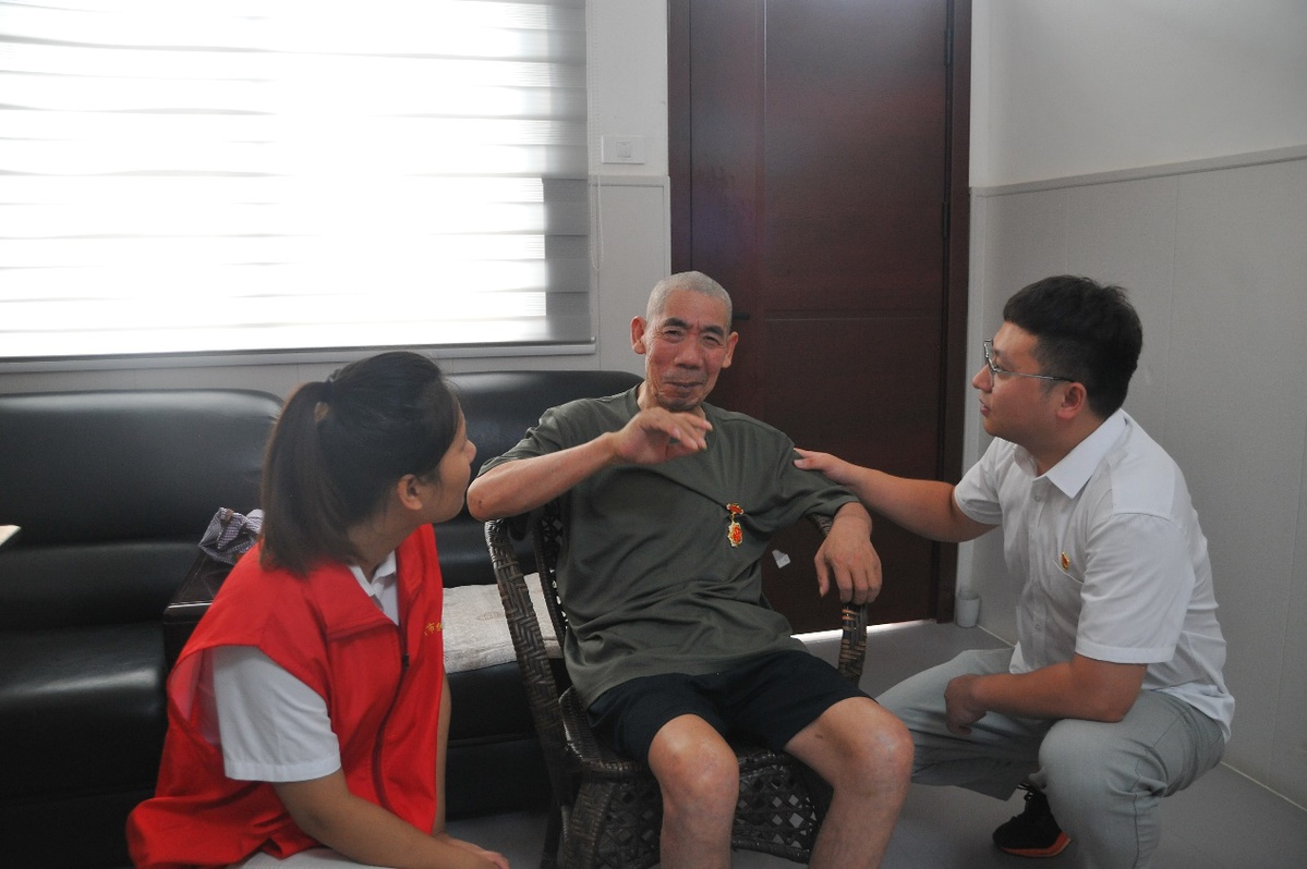 活動中,在看望98歲高齡的抗戰老兵李位發和60歲老人宋洪彥時,志愿者給老人送上了精心準備的慰問品,和老人促膝交談,對其為國家所作出的貢獻表示感謝。老人向大家講述自己參加抗美援朝戰爭和中越邊境自衛反擊戰時的經歷。志愿者還詳細詢問了老人的身體健康情況,并叮囑老人要保重身體,祝愿老人健康長壽。