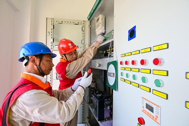 6月18日,國家電網(wǎng)江蘇電力(金湖飛虎)共產(chǎn)黨員服務(wù)隊(duì)隊(duì)員在金北街道萬莊校東泵站裝表接電,為農(nóng)田插秧抗旱提供可靠電力保障