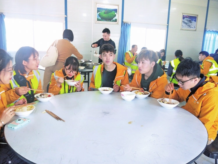 14名大學生在昆北換流站臨時食堂和建設者一起用午餐。南網傳媒全媒體記者 李剛 攝