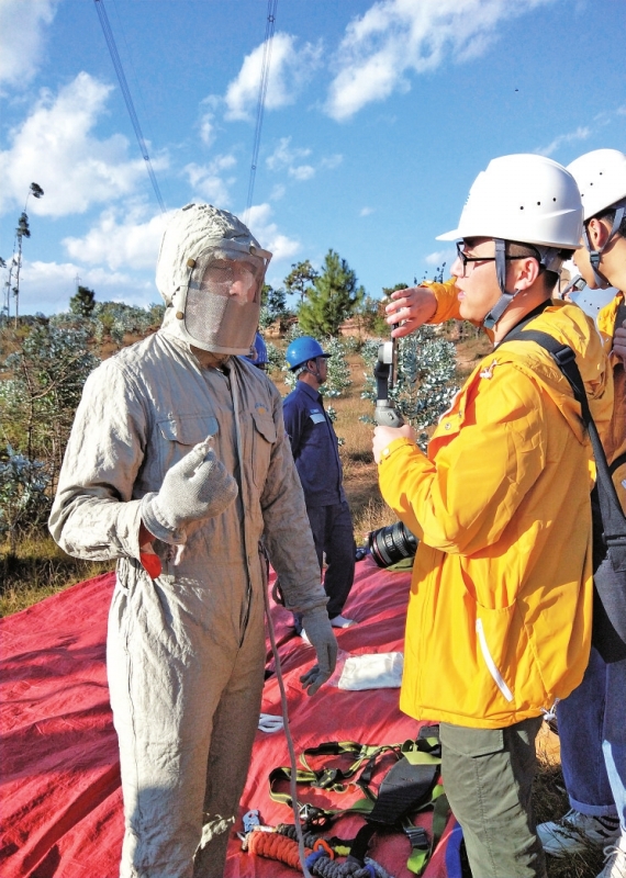 在±800千伏楚穗直流線路2號塔,當超高壓公司昆明局輸電管理所帶電班班長張曉輝向大家展示他的特高壓帶電作業屏蔽服時,武漢大學大四學生喬曉亮忍不住試穿了一把。穿上屏蔽服,開始喬曉亮覺得新鮮,但沿著高壓線路在地面走了不到十分鐘,額頭上立即冒出汗珠,“當架空輸電線路上出現故障時,帶電作業人員就需要穿著這樣的服裝背著三四十斤的工具,走在70多米的高塔上帶電作業,聽起來不可思議,但這就是南網員工的日常。”喬曉亮說。