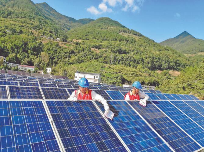 國家電網紅巖(巫溪營銷)共產黨員服務隊隊員擦拭村級光伏電站光伏發電板。湯和平 攝