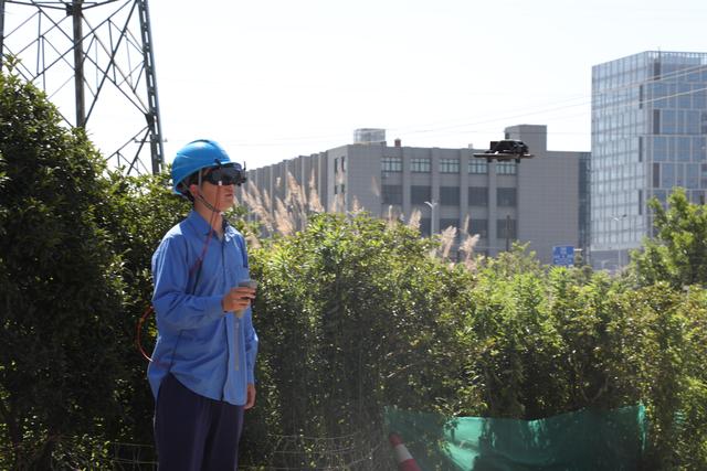 圖為工作人員應用飛行眼鏡操控無人機,對配電線路開展沉浸式巡線。新華社發(邵哲文 攝)