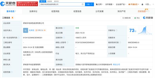 近日,舒城華電綠色能源有限公司成立,法定代表人為杜來會,注冊資本1000萬元人民幣,經營范圍含發電業務、輸電業務、供(配)電業務,儲能技術服務,風力發電技術服務,太陽能發電技術服務等。股東信息顯示,該公司由華電集團旗下華電安徽新能源有限公司全資持股。