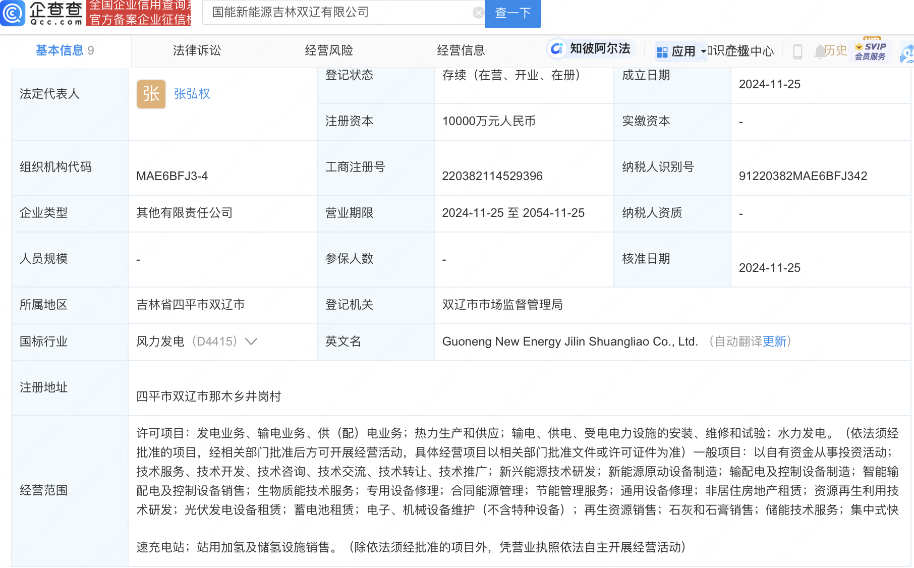 近日,國能新能源吉林雙遼有限公司成立,法定代表人為張弘權,注冊資本1億人民幣,經營范圍含新興能源技術研發、新能源原動設備制造、生物質能技術服務等。企查查股權穿透顯示,該公司由國家能源投資集團有限責任公司旗下國能吉林新能源發展有限公司、國能雙遼發電有限公司共同持股。