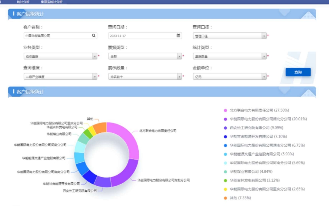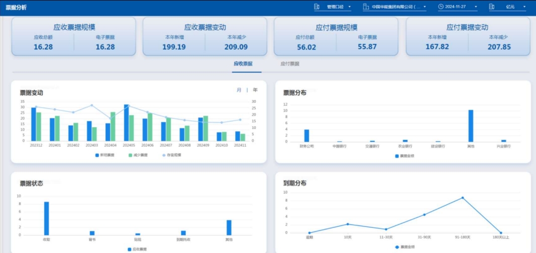 在此基礎上,開通了涵蓋整個華能集團成員單位的票據信息全口徑、全流程、多維度的統計分析功能,三級管理體系下分層穿透監管,能夠按照種類、地域、產權口徑、承兌行以及重要性等進行交互式展示,降低集團票據“多、散、松”的管理風險。