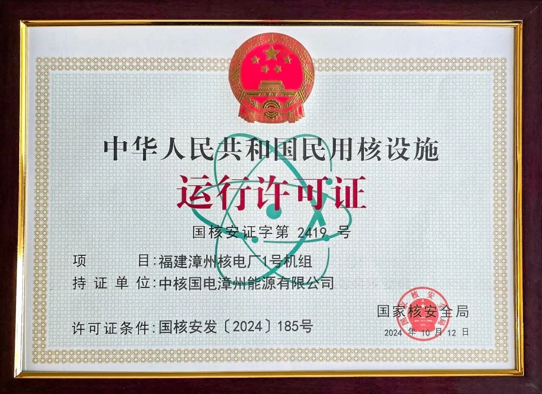 10月12日,生態(tài)環(huán)境部向中核集團旗下中國核電(股票代碼:601985)投資控股的漳州核電1號機組頒發(fā)運行許可證。生態(tài)環(huán)境部副部長、國家核安全局局長董保同出席儀式并為漳州能源頒發(fā)許可證,中核集團黨組成員、副總經(jīng)理張凱出席并見證頒證儀式。15時18分,漳州核電1號機組開始裝載首爐核燃料,標志著機組進入主系統(tǒng)帶核調(diào)試階段,為后續(xù)機組臨界、并網(wǎng)發(fā)電等工作奠定了堅實基礎(chǔ)。