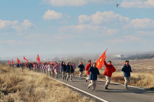 徒步隊伍精神飽滿、興致高昂、闊步向前,走出廠門后從虎山腳下沿黃營村棗林觀光道向上前行。途經之處生態風景獨特、空氣凌冽清澈,全體人員邁著矯健的步伐、排著整齊的隊伍、揮舞著鮮艷的國旗,激情迸發、活力四射,徒步完成近7公里的路程,在碧空湛藍、冬陽高照的風景里,描繪了一幅幅團結一心、眾志成城的拼搏畫面。