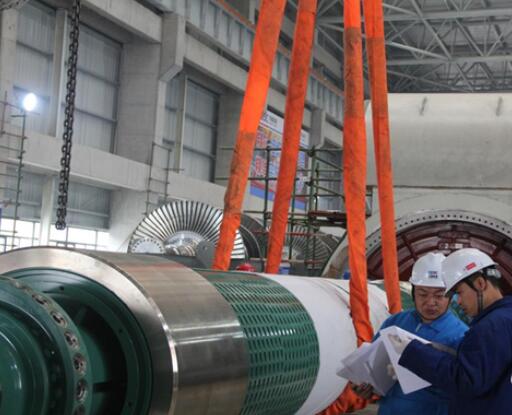 作業人員正在進行轉子檢查試吊、調整轉子水平