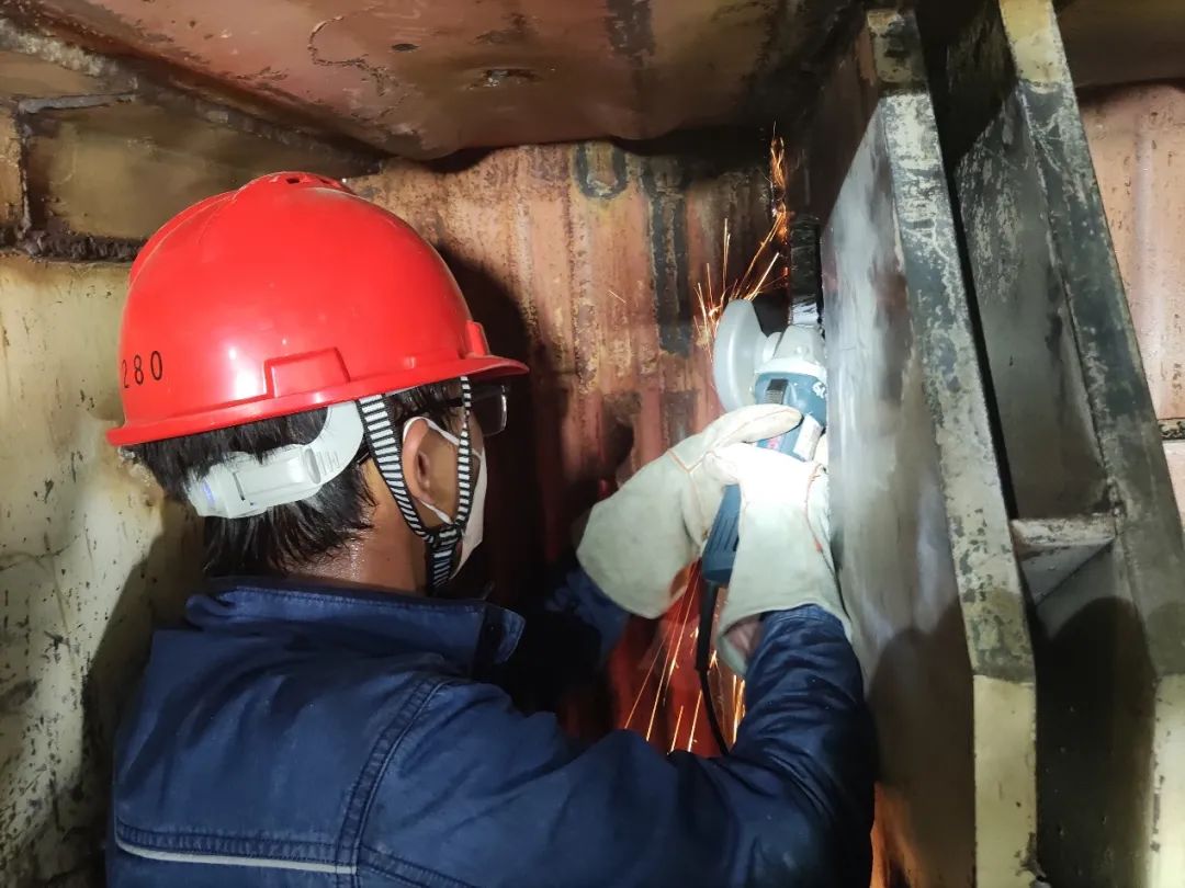 迎峰度夏期間,陜投集團趙石畔煤電檢修人員采取各種措施保證設備健康穩定運行,加強對主、輔機設備的運行調整、檢修維護,對重點防汛地段、部位進行專項檢查。特別是出現緊急情況下的搶修工作,往往是輪番上陣,人歇工作不停。圖中,點檢郭生磊在鍋爐房消除設備膨脹受限缺陷,他手持角磨機一干就是半個多小時,面對噪音、高溫、火星飛濺等因素他堅持作業。當缺陷消除時,他的衣服早已濕透,但臉上卻露出了笑容。(李磊)