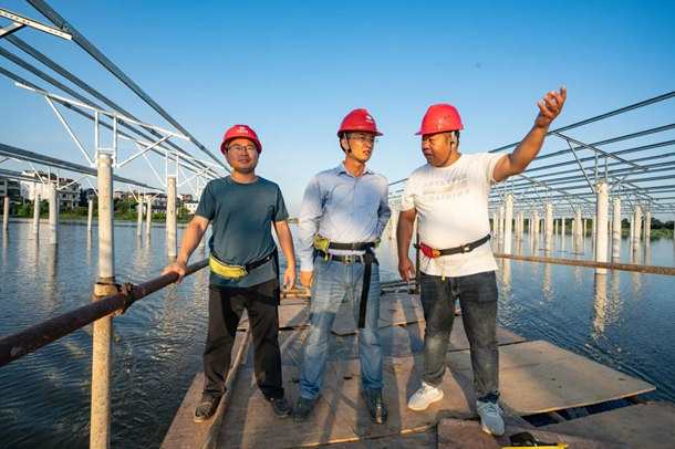 “從乘浮船‘踩點’開始,工作盡量提前,凡事親力親為,特別是三伏天后天氣超熱,我們避開最熱時段,早上4點就到現場,業主心疼我,我心疼工友,工友自然干勁足。打樁效率、質量直接關系到后續光伏面板安裝進度和全容量并網任務,不打好提前量,對不起業主方的信任厚愛……”,7月16日,茶從湖標段已打完4800余根樁基,完成80%以上的任務,光伏面板安裝進度超20%。8月15日再找他時,早已在江埠項目堯咀光伏區鏖戰了。