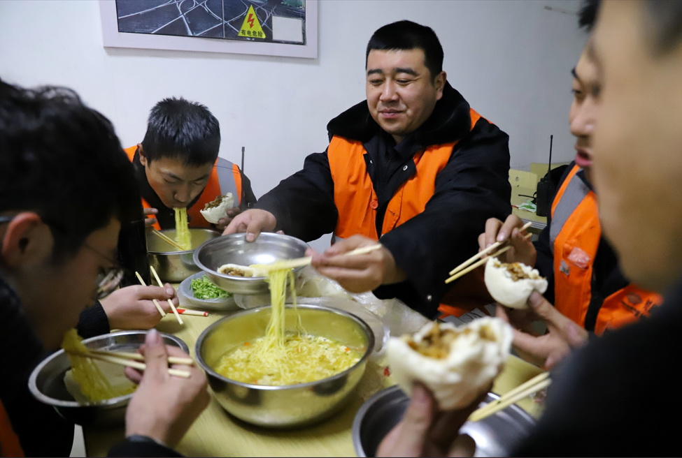 檢車員們列著整齊的隊伍滿心歡喜地奔向待檢室,圍坐在臨時飯桌旁,他們那一雙雙因長時間戶外作業而黝黑、僵硬的手,與桌上潔白的筷子形成鮮明對比。餐桌上的面條、饅頭和加熱的菜肴雖簡單,卻在寒夜中散發著溫暖。