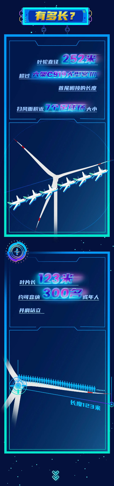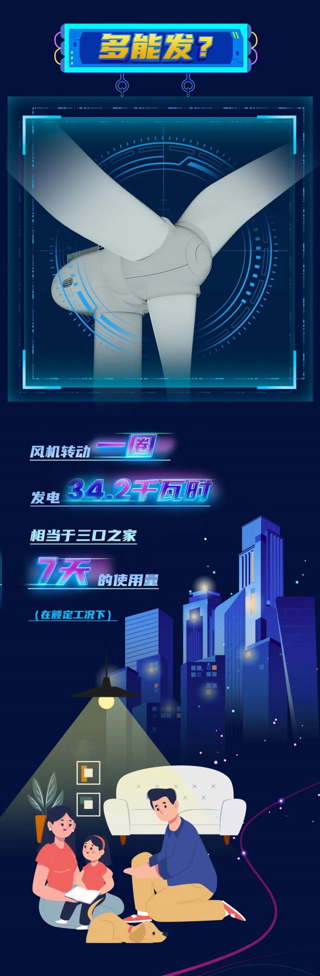 此次下線的單機容量16兆瓦海上風(fēng)電機組,葉輪直徑252米,葉輪掃風(fēng)面積約5萬平方米,約相當(dāng)于7個標(biāo)準(zhǔn)足球場大;輪轂高度達146米,約相當(dāng)于一座50層大樓的高度。在額定工況下,單臺機組每轉(zhuǎn)動一圈可發(fā)電34.2千瓦時。根據(jù)多年平均發(fā)電量設(shè)計值,單臺機組每年可輸出超過6600萬千瓦時的清潔電能,能夠滿足3.6萬戶三口之家一年的生活用電,可節(jié)約標(biāo)煤約2.2萬噸,減排二氧化碳約5.4萬噸。