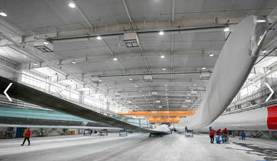 2月9日,在內蒙古烏蘭察布市遠景北方能源有限公司,質檢員在風機葉片生產線上工作。
