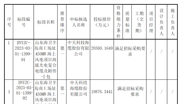 7月14日,國家電投電子商務平臺發布《國家電力投資集團有限公司二〇二三年度第十七批集中招標(山東分公司海衛半島南 U場址450MW海上風電項目海底光電復合電纜及附件)中標候選人公示》的公告。