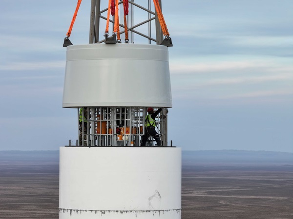 該首臺(tái)套風(fēng)電機(jī)組并網(wǎng),標(biāo)志著全球規(guī)模化商用最大混塔風(fēng)力發(fā)電機(jī)組在內(nèi)蒙古能源集團(tuán)成功發(fā)電運(yùn)行。項(xiàng)目使用的風(fēng)電設(shè)備單機(jī)容量10兆瓦,混塔高134.4米,整機(jī)高度140米,葉片長(zhǎng)112米,風(fēng)輪直徑230米,覆蓋及掃風(fēng)面積更大,經(jīng)濟(jì)性和發(fā)電量相對(duì)更高。值得一提的是,此項(xiàng)目風(fēng)機(jī)塔筒由鋼筋混凝土中空、重力式基礎(chǔ)+上部高強(qiáng)混凝土預(yù)制管片疊合而成,是國(guó)內(nèi)首次采用內(nèi)張拉、預(yù)應(yīng)力技術(shù)的10兆瓦混塔風(fēng)力發(fā)電項(xiàng)目。塔筒內(nèi)部預(yù)留孔洞固定鋼纜,鋼纜固定后進(jìn)行水泥灌漿填充縫隙,風(fēng)機(jī)運(yùn)行中旋轉(zhuǎn)產(chǎn)生擺動(dòng),使用此技術(shù),在擺動(dòng)時(shí),塔筒內(nèi)部結(jié)構(gòu)均勻受力,整體擺幅程度大大降低,使塔筒整體性更好、耐久性更強(qiáng)、預(yù)應(yīng)力損失小,混塔結(jié)構(gòu)塔筒優(yōu)勢(shì)突出。