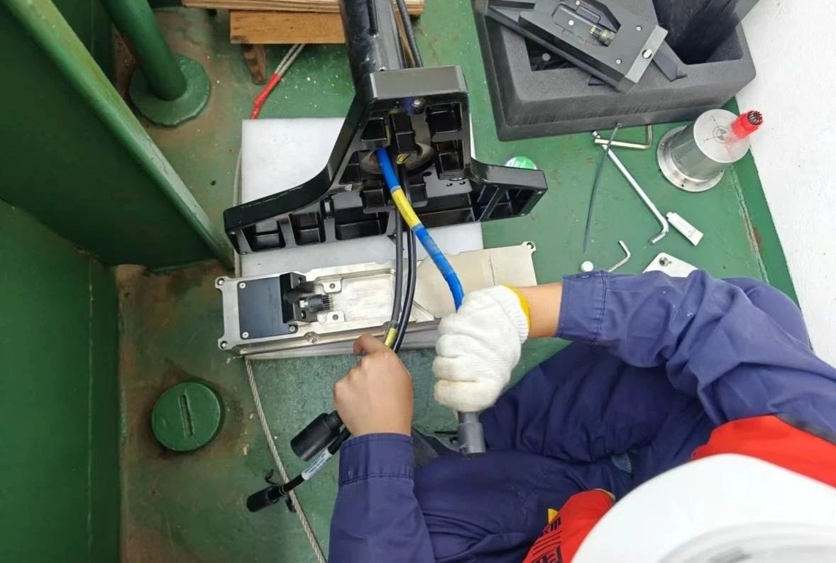 三峽能源江蘇運(yùn)維公司海工試驗(yàn)中心員工將多波束測(cè)深系統(tǒng)換能器從海里收回