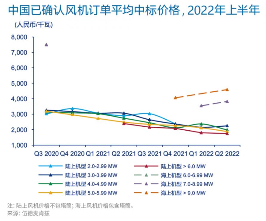 陸上風機平均中標價格在2022年第一季度再創新低。在首個7MW+陸上風電機組的批量訂單中,出現了歷史最低中標價格1408元/千瓦(不含塔筒)。雖然第二季度價格略有回升,但較2021年底水平仍下降了15%。新簽無補貼的海上項目與時間上最鄰近的有補貼的海上項目(2020年)相比,風機平均中標價格(含塔筒)下降了超過40%。大兆瓦機組的廣泛應用,使中國風電整機商能夠以較低的單位千瓦價格進行投標。例如,6MW陸上風機的平均價格比3MW陸上風機平均價格低22%。