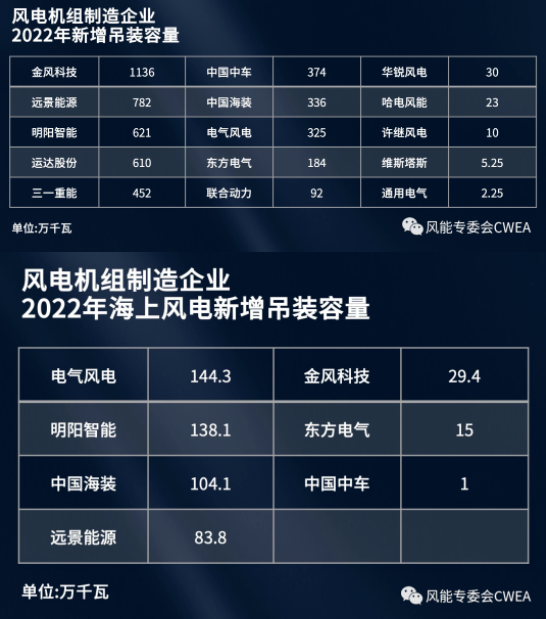 2022年,中國(guó)新增吊裝容量前五的風(fēng)電機(jī)組制造企業(yè)是金風(fēng)科技、遠(yuǎn)景能源、明陽智能、運(yùn)達(dá)股份、三一重能,其新增裝機(jī)容量分別為1136萬千瓦、782萬千瓦、621萬千瓦、610萬千瓦、452萬千瓦。