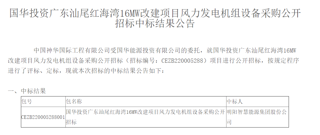日前,國華投資廣東汕尾紅海灣16MW改建項目風力發電機組設備采購公開招標結果,明陽智能成功中標;國華投資國華(汕尾)風電有限公司紅海灣風電場項目EPC總承包工程公開招標結果,明陽智能旗下潤陽能源技術有限公司(簡稱:潤陽能源)全資子公司天津明智潤陽技術有限公司成功中標。