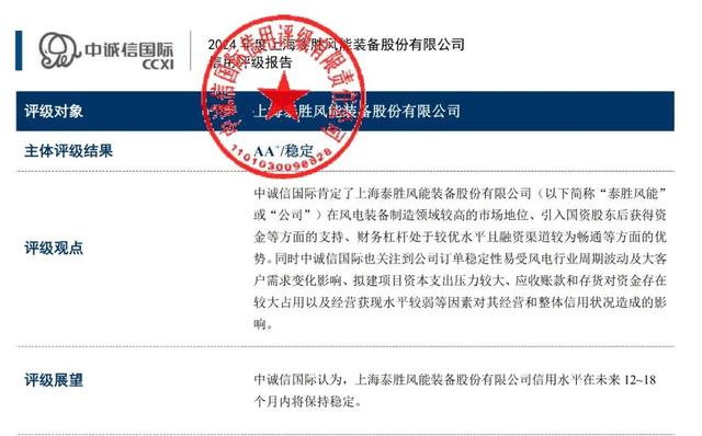 中誠信,作為業(yè)內(nèi)公認(rèn)的頂級信用評級機(jī)構(gòu),其評級體系嚴(yán)謹(jǐn)而公正。泰勝風(fēng)能憑借在風(fēng)電裝備制造市場的龍頭地位、生產(chǎn)基地的戰(zhàn)略性布局及碼頭資源的獨(dú)特優(yōu)勢,贏得了中誠信的高度贊譽(yù)。公司穩(wěn)健的利潤增長、科學(xué)的財(cái)務(wù)結(jié)構(gòu)、雄厚的資本實(shí)力以及清晰而廣闊的發(fā)展藍(lán)圖,共同構(gòu)筑了“AA+”評級的堅(jiān)實(shí)基石。